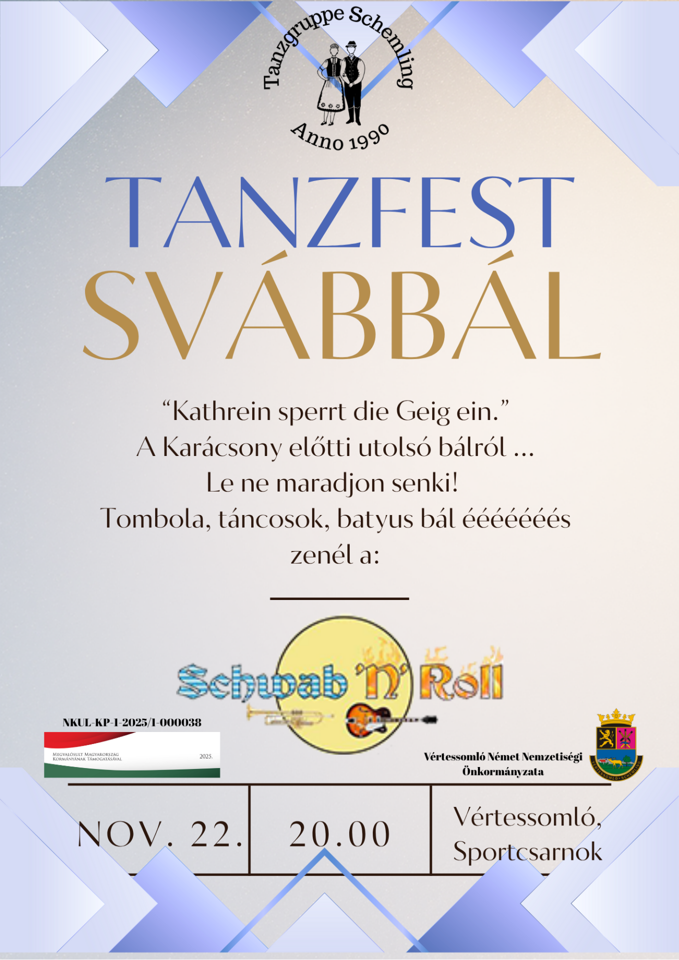 Idei Tanzfest svábbálunk remek hangulatban telt, megtöltötték a vértessomlói sportcsarnokot a táncolni, bálozni vágyók. A talpalávalót a Die Lausbuben húzta, majd fél 10-kor a vértessomlói felnőtt táncosok vették birtokba a táncparkettet, akik 3 koroegráfiával színesítették az estét. A táncosoknak a SchemlingerMusikanten zenélt, akik utána további egy órán keresztül szórakoztatták a nagyérdeműt, mielőtt visszatért a színpadra a Lausbuben.